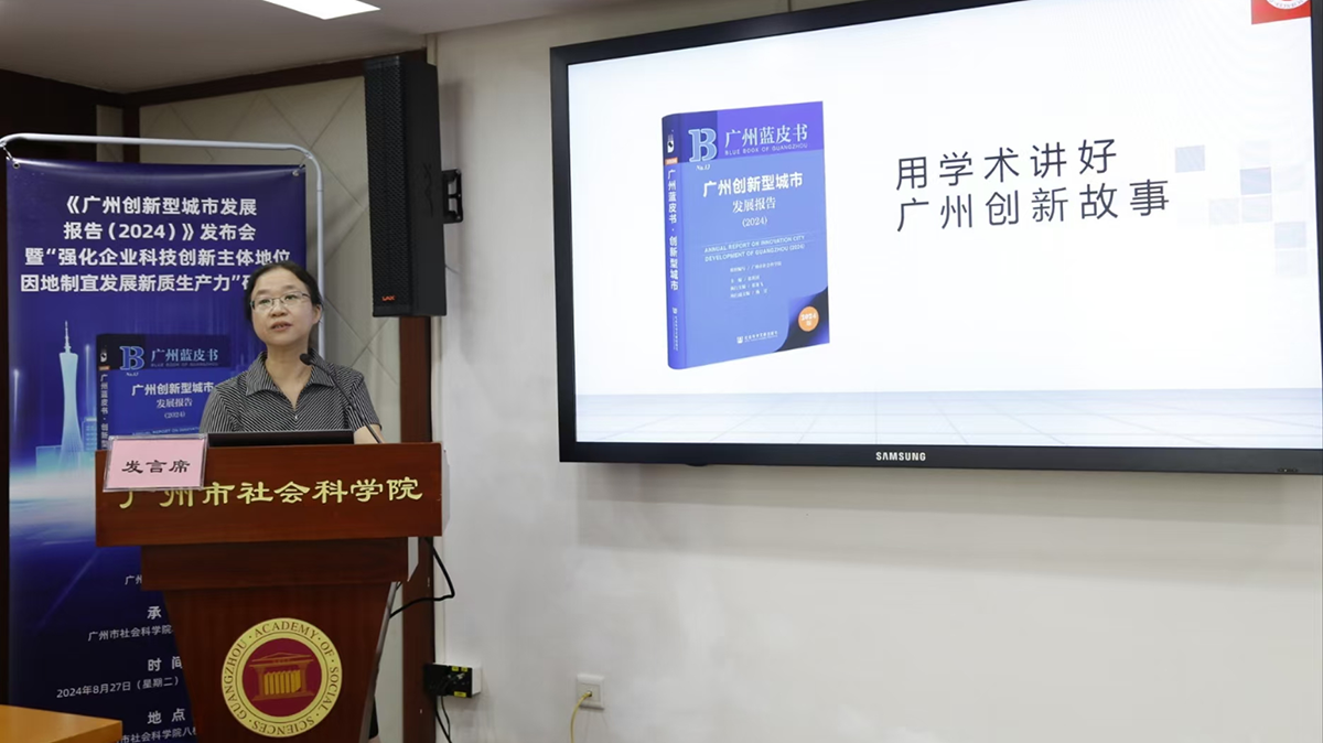 2024年8月27日,由广州市社会科学院主办,广州市社会科学院科技创新研究所承办的《广州创新型城市发展报告(2024)》发布会暨“强化企业科技创新主体地位因地制宜发展新质生产力”研讨会成功举办。会议由广州市社会科学院科技创新研究所所长张赛飞研究员主持,广州市城市规划勘测设计研究院、广州恒成智道信息科技有限公司、广州市社会科学院等机构的专家学者以及多家主流媒体代表出席了会议。