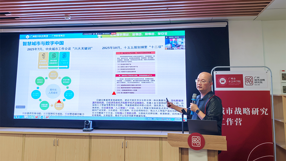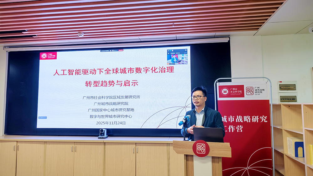 2025年11月24日,第十三期城市战略研究工作营“人工智能驱动下全球城市数字化治理转型趋势与前瞻研讨会”成功召开。本次研讨会由广州市社会科学院主办,广州市社会科学院区域发展研究所、广州城市战略研究院、广州国家中心城市研究基地、数字与世界城市研究中心承办,《城市观察》杂志社协办。会议由广州市社会科学院科研处处长蔡进兵主持,来自浙江大学、北京师范大学、中山大学、广州市政务服务和数据管理局、广州数据集团、广州市城市规划勘测设计研究院等高校院所、政府部门、企业的专家学者参会交流。