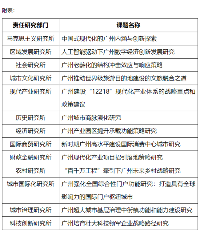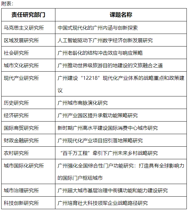 2025年是实施“十四五”规划的关键一年,也是谋划“十五五”发展的重要起步之年。我院坚持以习近平新时代中国特色社会主义思想为指导,紧扣时代脉搏、立足“十五五”时期广州发展所需,从年初启动课题选题工作,经过各研究所申报、院内外多轮专家论证、院党组会议审定等流程,最终从39个选题中凝练确立《中国式现代化的广州内涵与创新探索》等13项重大课题。选题涵盖数字经济、老龄化应对、文旅融合、产业体系、基层治理、科技企业培育等多个前沿领域,全面呼应广州在新时代新征程中的发展需求。重大课题作为服务党委政府决策的科研母机和核心载体,衍生了50多项决策研发课题,转化了40多篇决策研究报告,充分体现了在城市发展战略谋划中的重要支撑作用。