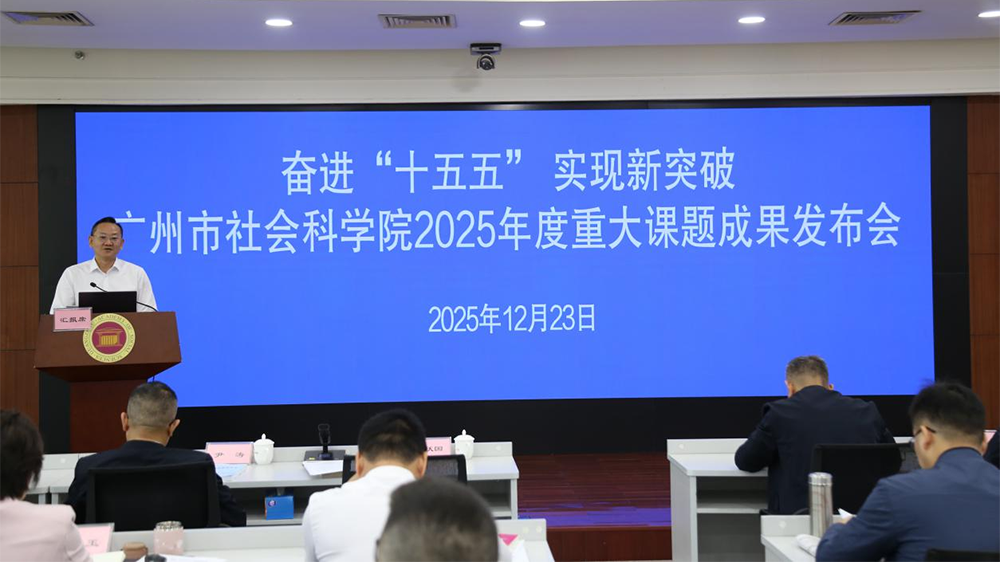 2025年12月23日,广州市社会科学院2025年度重大课题成果发布会在院九楼会议室成功举办。发布会以“奋进‘十五五’ 实现新突破”为主题,集中发布了13项重大课题成果。院党组书记、院长张跃国出席会议并讲话,副院长伍庆主持会议,副院长周成华、尹涛出席会议。