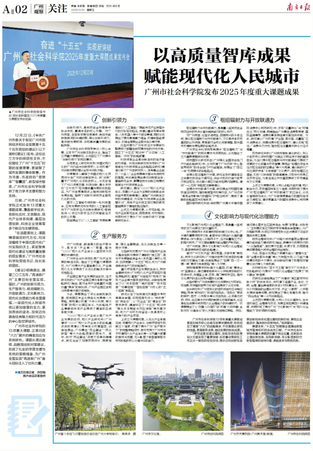 广州市社会科学院的13项重大课题,正是对这“六力”展开的精准回应与系统研究。课题从理论阐释、战略路径到对策建议,形成了扎实的学理支撑与系统的策略储备,为广州全面实现“再造新广州”奋斗目标注入了社科力量。