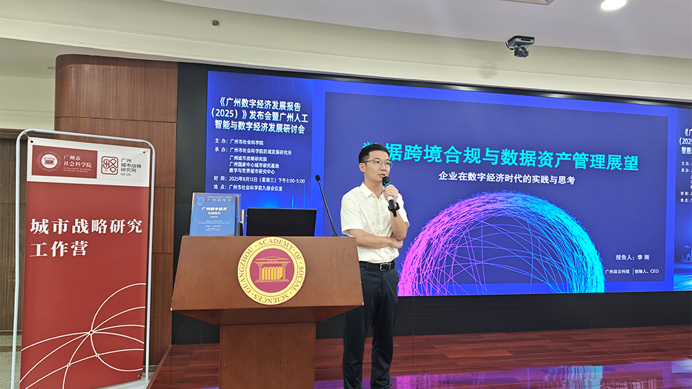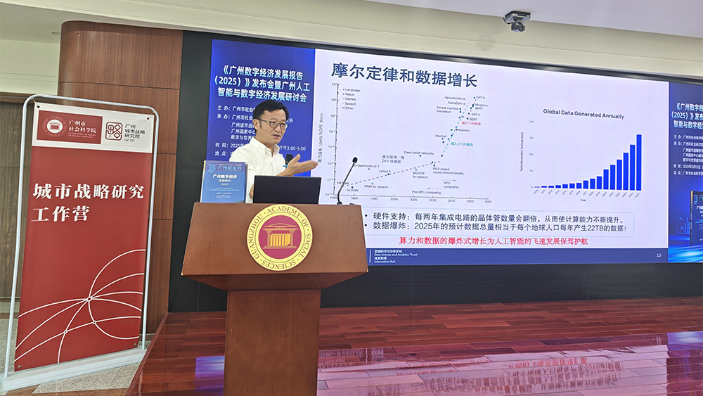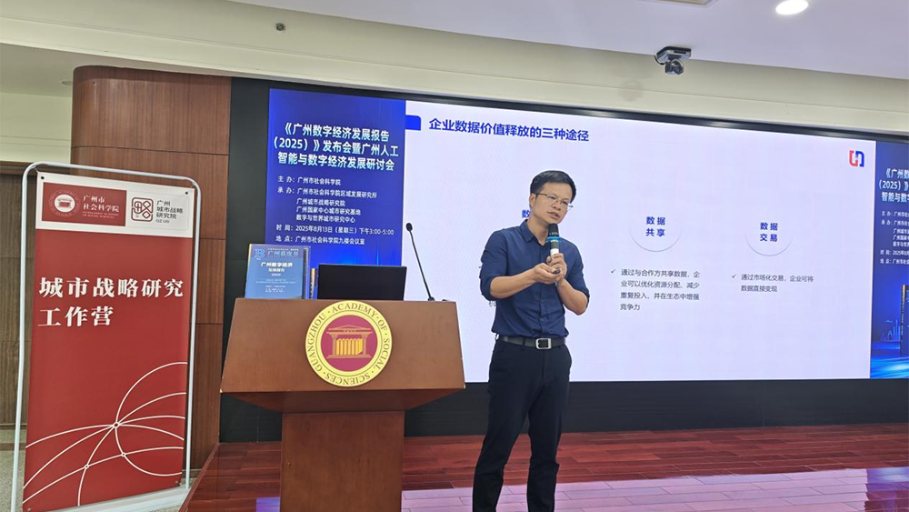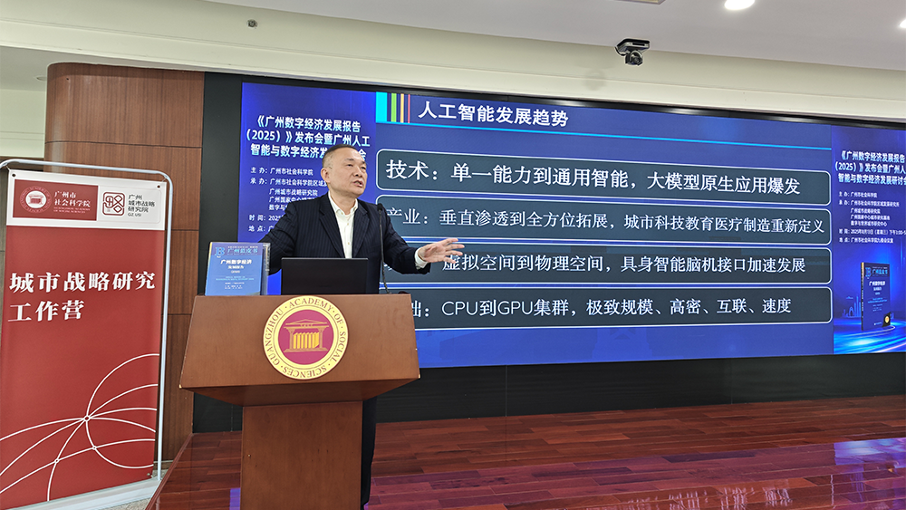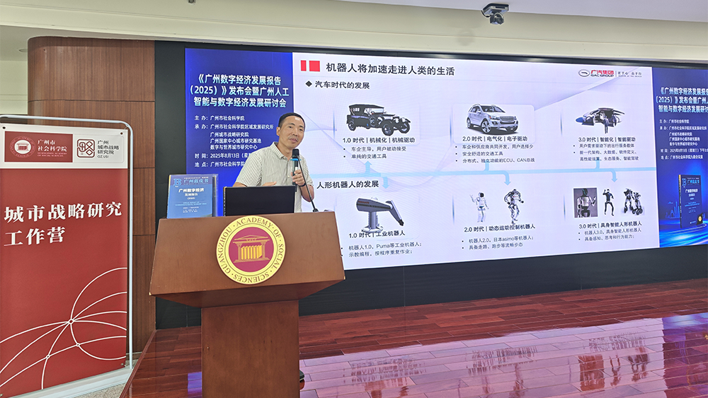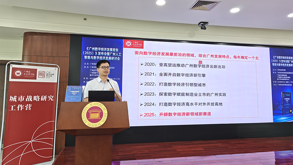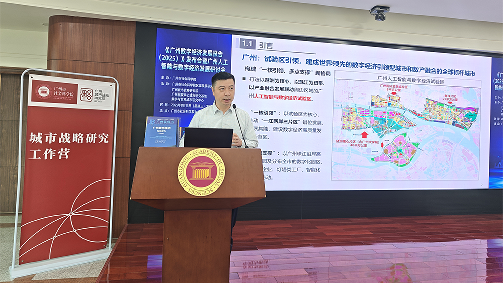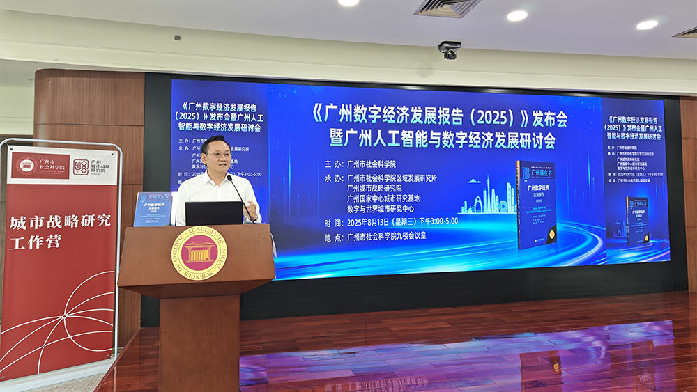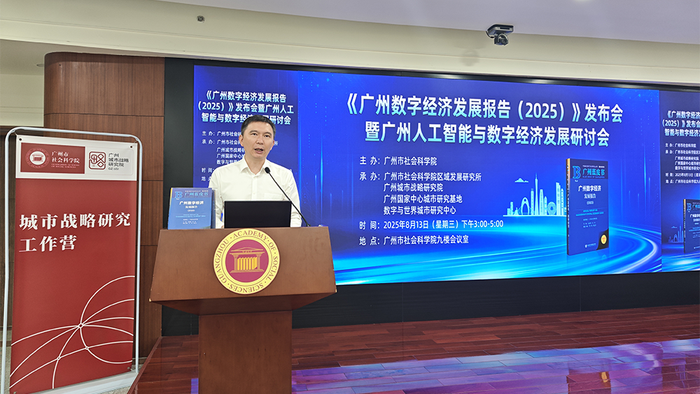 2025年8月13日,广州市社会科学院、社会科学文献出版社联合发布了《广州数字经济发展报告(2025)》蓝皮书,并召开广州人工智能与数字经济发展研讨会。本次会议由广州市社会科学院主办,广州市社会科学院区域发展研究所、广州城市战略研究院、广州国家中心城市研究基地、数字与世界城市研究中心承办。会议由广州市社会科学院副院长、《广州数字经济发展报告》主编伍庆主持,广州市社会科学院党组书记、院长,《广州数字经济发展报告》主编张跃国发表致辞演讲,来自华南理工大学、香港科技大学、广州市城市规划勘测设计院、广汽集团、广州数据交易所、广州政云科技有限公司的专家学者、企业家发表专题演讲,来自党政部门、高校院所、企业界的代表和媒体记者参加本次会议。